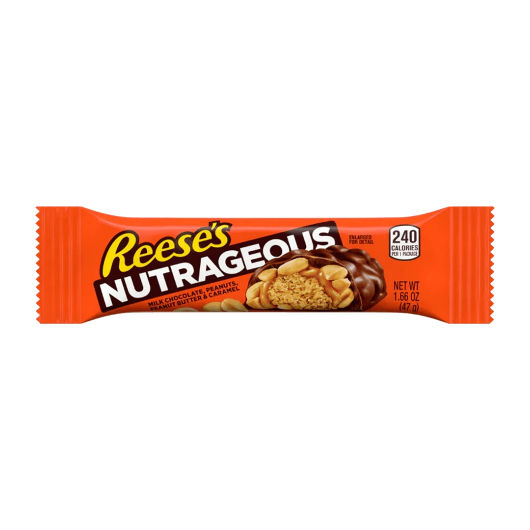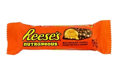 Reeses Nutrageous Bars is a peanut butter bar with caramel and whole peanuts.