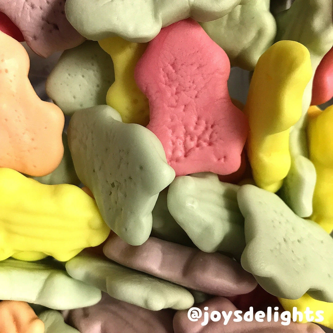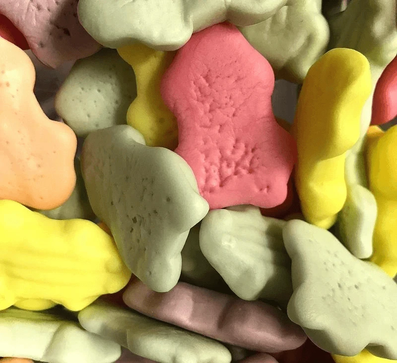 Ingredients:Â Sugar, Corn Syrup, Gelatine, Modified Starch, Sorbitol, Citric Acid(330), Flavours, Vegetable Oil, Carnauba Wax, Colours(Curcumin100, Cochineal120, Chlorophyllis141, Anthocyanins163). Gluten Free