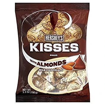 Hershey’s Kisses with Almonds are the classic Hershey’s milk chocolate Kisses you know and love, just with an added almond surprise inside each one. Deliciously creamy, now with a crunchy addition.