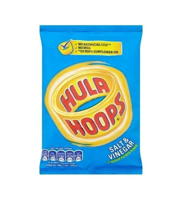 Hula Hoops are a classic British snack! Perfect for stacking on your fingers and eating one or multiple at a time, these crunchy potato crisps with added salt and vinegar flavours are a delicious treat.