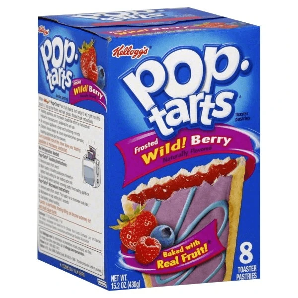 Ingredients: Berry Filling (Corn Syrup, Dextrose, High Fructose Corn Syrup, Crackermeal, Modified Wheat Starch, Partially Hydrogenated Soybean Oil, Dried Strawberries, Dried Apples, Dried Pears, Citric Acid, Natural Wild Berry Flavor, Xanthan Gum, Caramel Color, Soy Lecithin, Red No. 40, Blue No. 2, Yellow No. 6), Enriched Wheat Flour, Sugar, Partially Hydrogenated Soybean Oil, Corn Syrup, High Fructose Corn Syrup, Salt, Corn Starch, Leavening (Baking Soda, Sodium Acid Pyrophosphate, Monocalcium Phosphate), Gelatin, Dextrose, Sorbitol, Carmine Color, Blue No. 2, Niacinamide, Blue No. 1, Reduced Iron, Vitamin A Palmitate, Pyridoxine Hydrochloride (Vitamin B6), Riboflavin (Vitamin B2), Tumeric Color, Gum Arabic, Thiamin Hydrochloride (Vitamin B1), and Folic Acid.