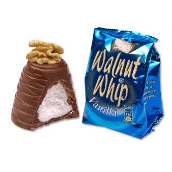 A cone of delicious, walnutty awesomeness. Smooth milk chocolate surrounding a walnut and vanilla whipped cream, topped with a candied walnut. Buy Walnut Whip online.