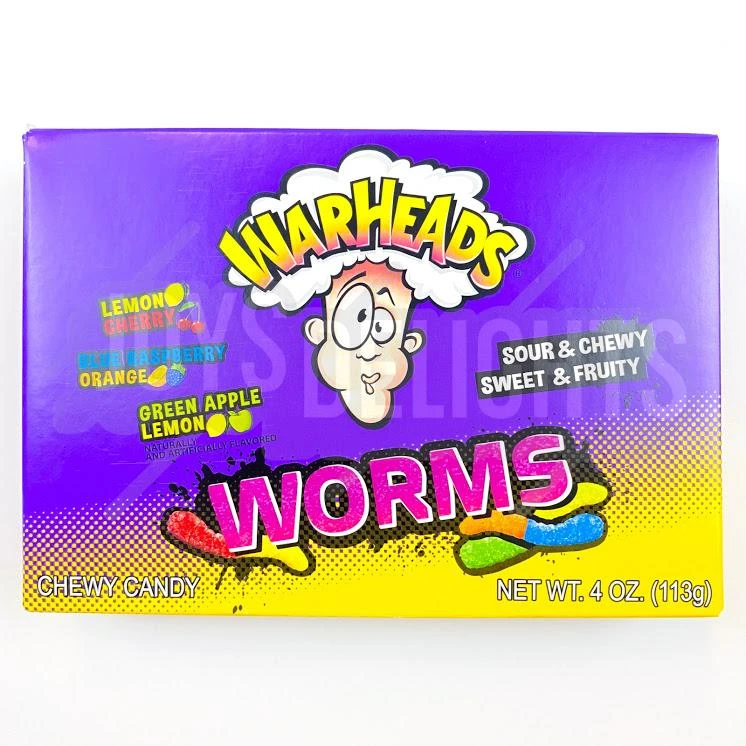 Warheads claim that these are the most sour worms ever made––can you handle the challenge?! This Theater Box comes with worms in three different flavours: green apple and lemon, blue raspberry and orange, and lemon and cherry.