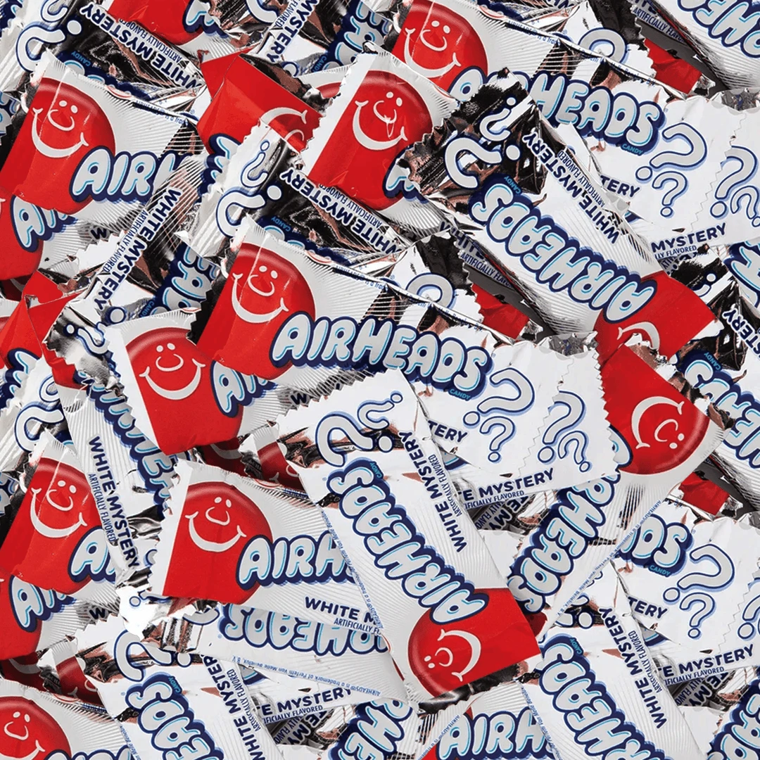un-sized bars of Airheads Mystery Flavor Taffy, in the shiny silver wrapper. Great for silver-themed candy buffets, Halloween trick-or-treat goodies, or for a fun lunch box treat. Take a bite and try to guess the fruity Airhead flavor.