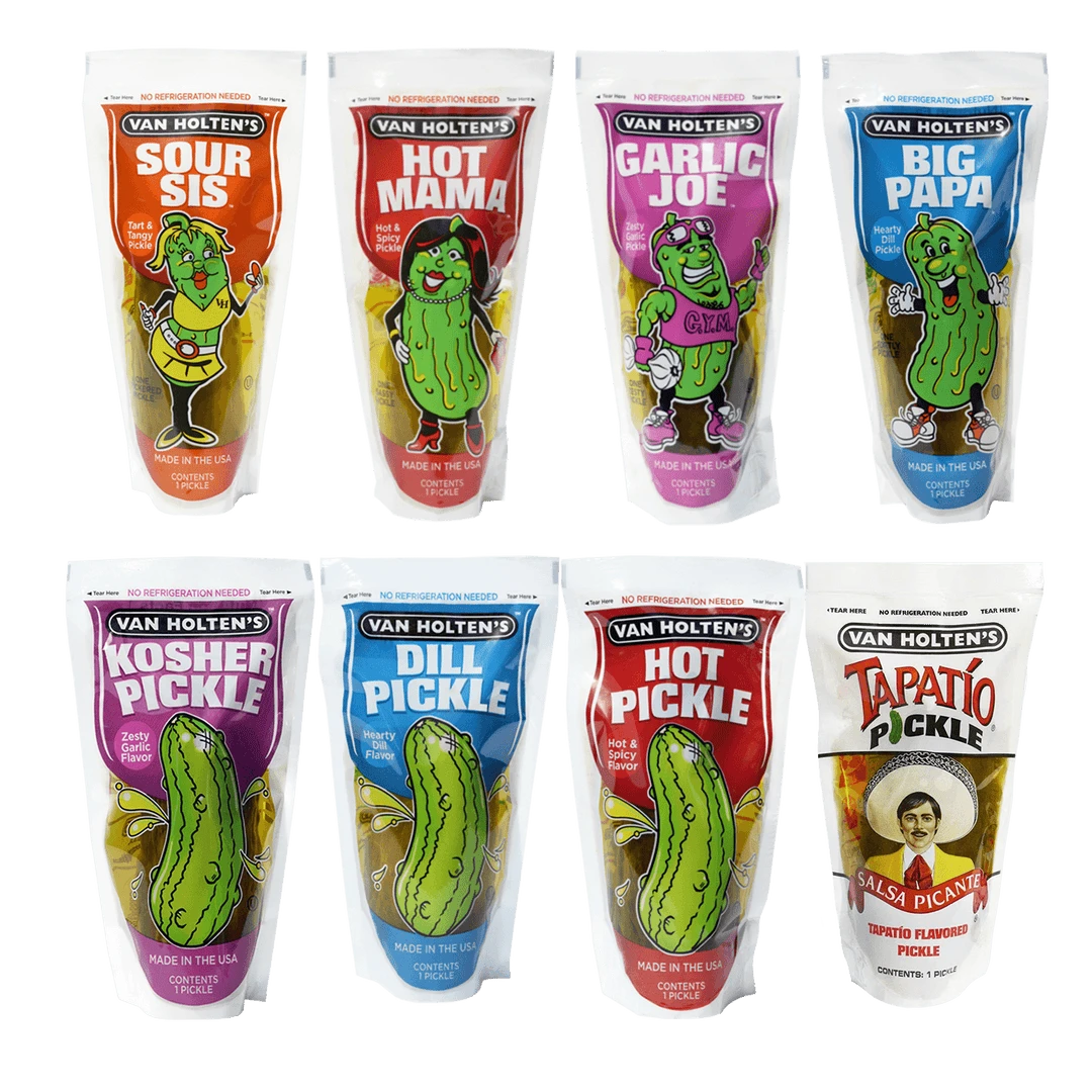 Big Papa, Hot Mama, Sour Siss, Garlic Joe, Dill, Hot, Kosher Garlic & Tapatio.Â